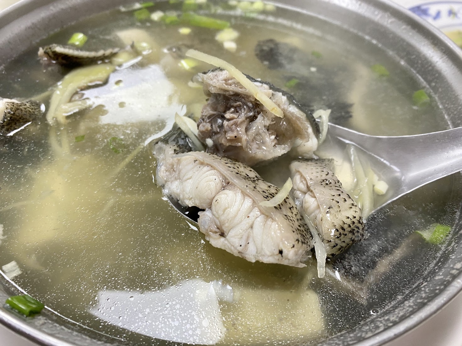 店家將骨頭較多的部分都拿來煮湯,不過裡面的魚塊不少,可見這尾魚真的非常大隻。即使是魚尾部分,上面的肉還不少,一塊比一塊大,湯頭喝起來非常地清甜,到現在還念念不忘這湯頭的味道。