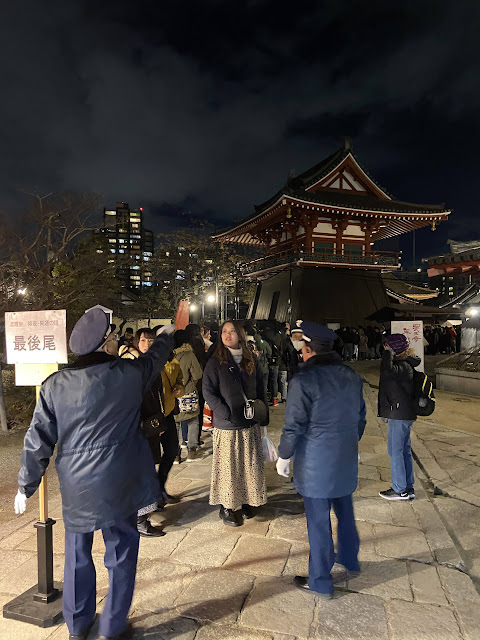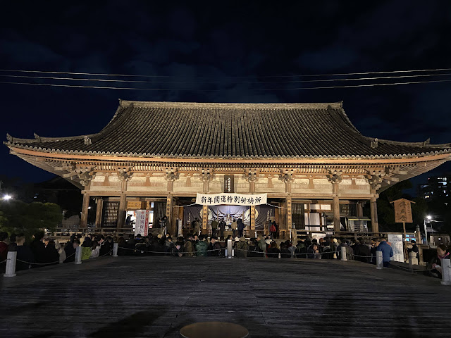 就在大家靜靜地聽著不遠處傳來的鐘聲,並看著手機的時間默默倒數,在第108響鐘聲響起後,就看著一旁的日本人小小聲的歡呼及互相道賀新年快樂接著開始往殿內拜拜,讓我有點錯愕,想說至少會有一些儀式之類的,沒想到會是這麼平靜、簡單地度過新年。