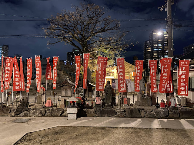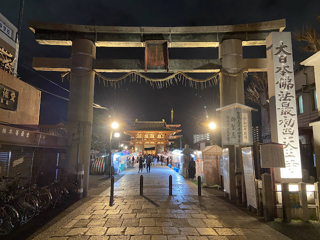 路上都沒人,而且旁邊都是墓地,因為這天的行程並不是我編排的,所以一路上不停地問著旅伴確定是這邊嗎?但四週真的太安靜,也沒什麼指標的,大家都沒來過四天王寺,他也給不出確定的答案給我,幸虧周圍的街道都很亮,加上遠處不停傳來敲鐘聲,確定前方應該是有活動的,才稍降低我心中的不安。