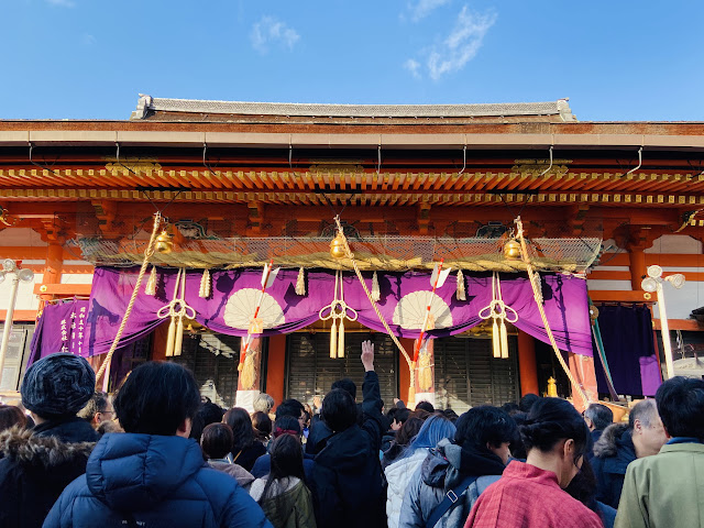 走向主殿前,還是一望無際的人海及攤販,沿路一直被食物的味道熏得肚子好餓,想說才抵達京都不到一小時就吃東西也太快了,應該撐一撐。結果就後悔了,因為下一餐我是過了6個小時才吃到,而且還是吃小吃。建議過年期間從八坂神社開始遊玩京都,可以現在這裡先吃一些墊肚子,因為等下一路到清水寺的路上,餐廳不是沒開就是人多爆。