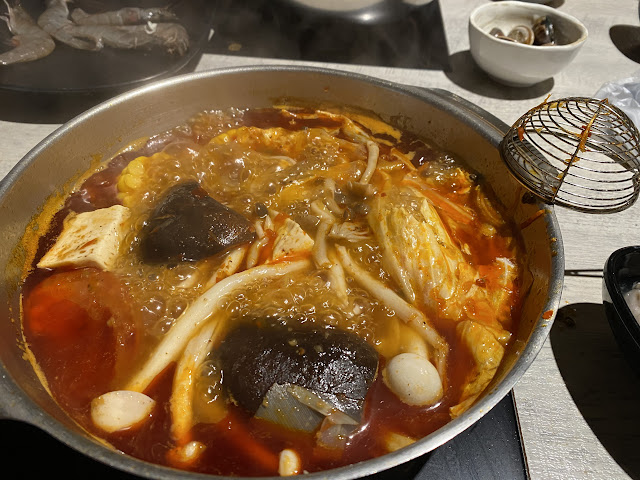 拿了許多的肉肉跟菜菜後,回到桌上,我點的麻辣口味湯頭也上桌了,這裡提供的都是個人涮涮鍋,不過以個人餐來說,鍋子也算很大,可以放不少東西一起煮。不過這次點的麻辣口味,漂浮在上面的油好多,整鍋都是紅彤彤的,讓我聯想到在大陸吃的麻辣鍋。